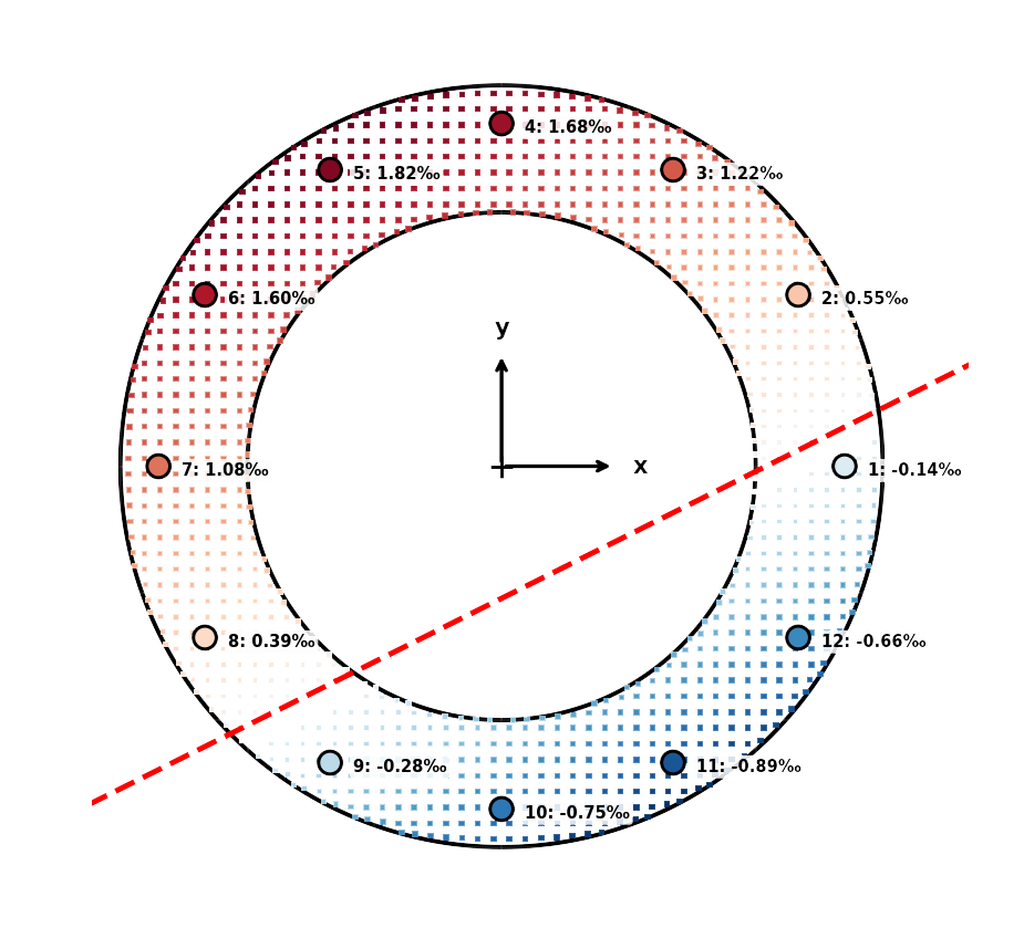 Utilization ratios: \(\eta = d/r\) for each demand point, where \(d\) is the distance from the domain centroid and \(r\) the distance to the boundary.